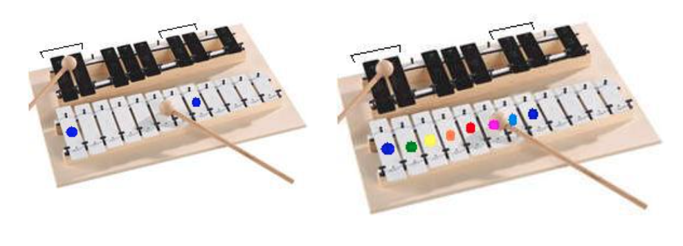 En el metalófono hay que identificar las placas de las notas alteradas o 2da fila,que van unidas de dos o de tres placas. Así como lo muestro en la imagen, cuando se reúnen dos placas en la segunda fila, la nota Do se encuentra inmeditamente a la izquierda mirado de frente, en el punto azul. Desde ahí, entonces subimos con las notas RE, MI, FA, SOL, LA, SI, DO. Etc.